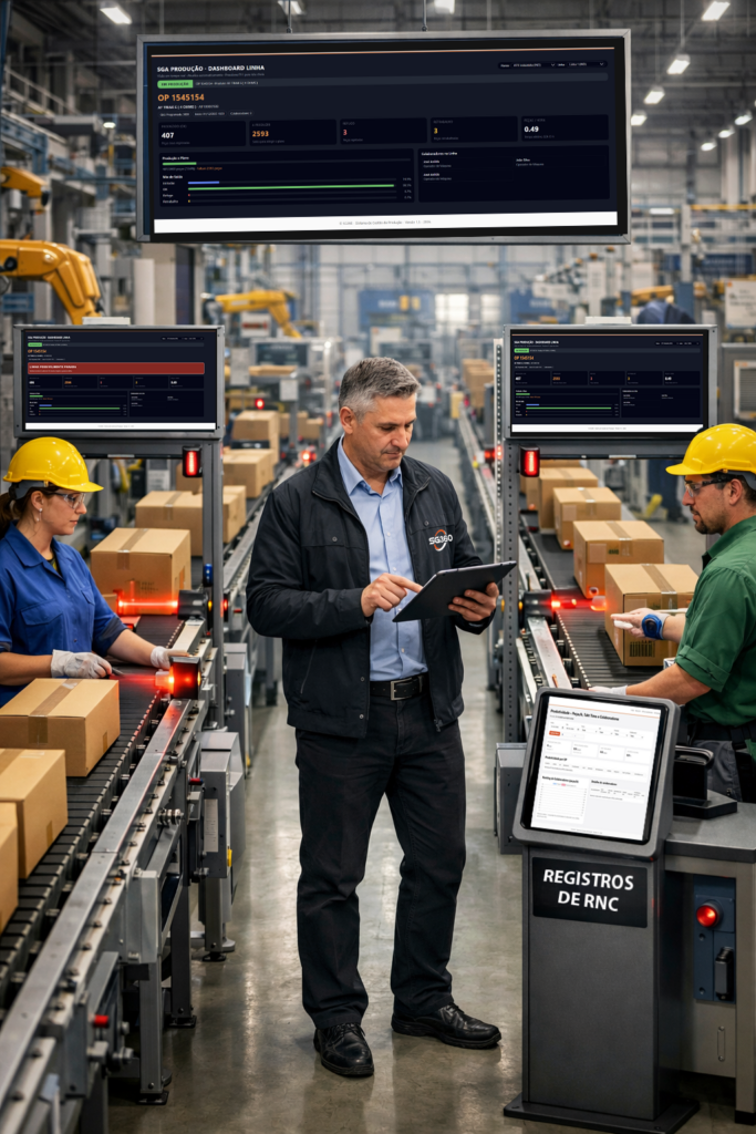 Conecta-se nativamente aos módulos de Produção, MES, KPIs, Relatórios, TV Rolante e Análises Gerenciais.