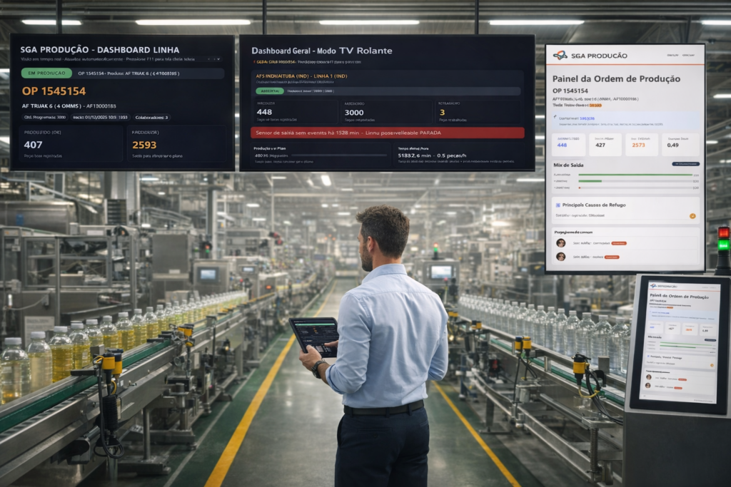 Ele atua entre o ERP e a produção, garantindo que o que acontece na linha seja refletido em tempo real nos indicadores.